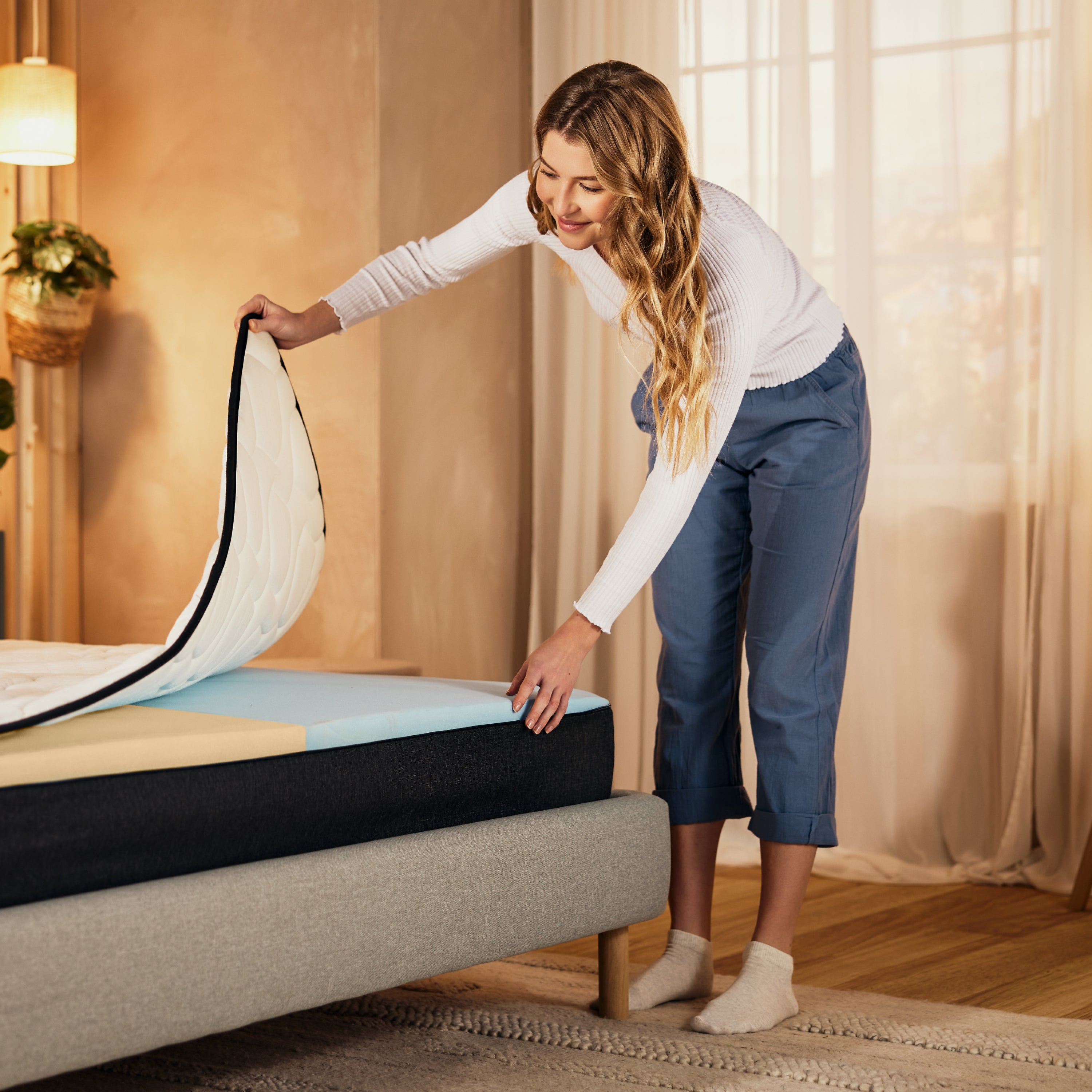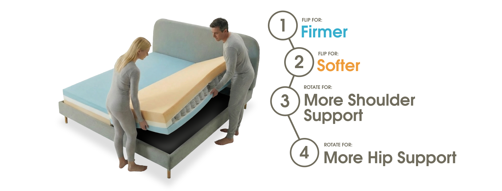 “I wanted a soft mattress. My husband wanted a firm one. Every bed we've had made one of us unhappy, until now! We set up each side exactly how we like it, and you can't even feel where the two sides meet — there's no gap or ridge at all. We both sleep great!”